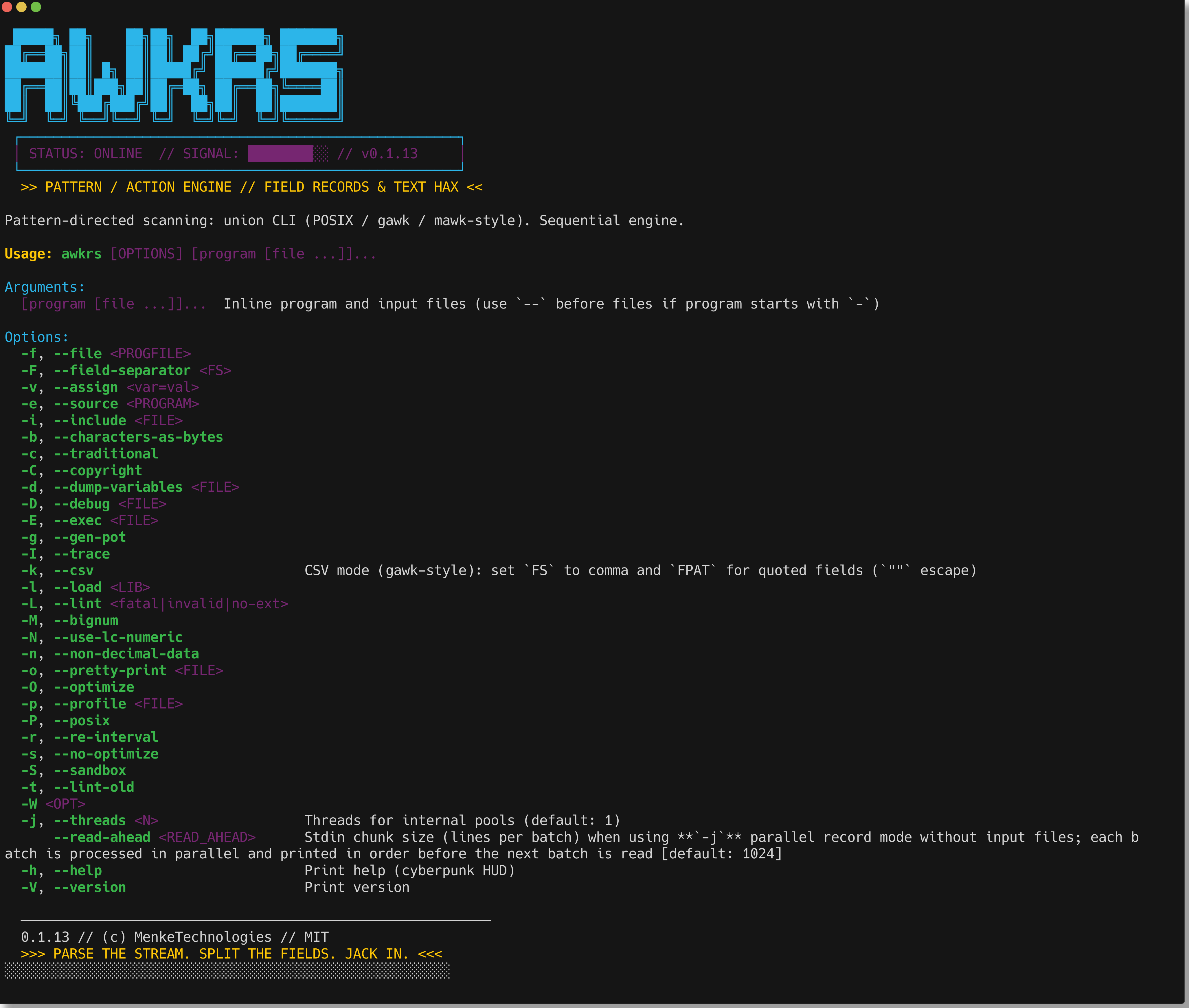 Awk implementation in Rust with broad CLI compatibility, parallel records, and experimental Cranelift JIT