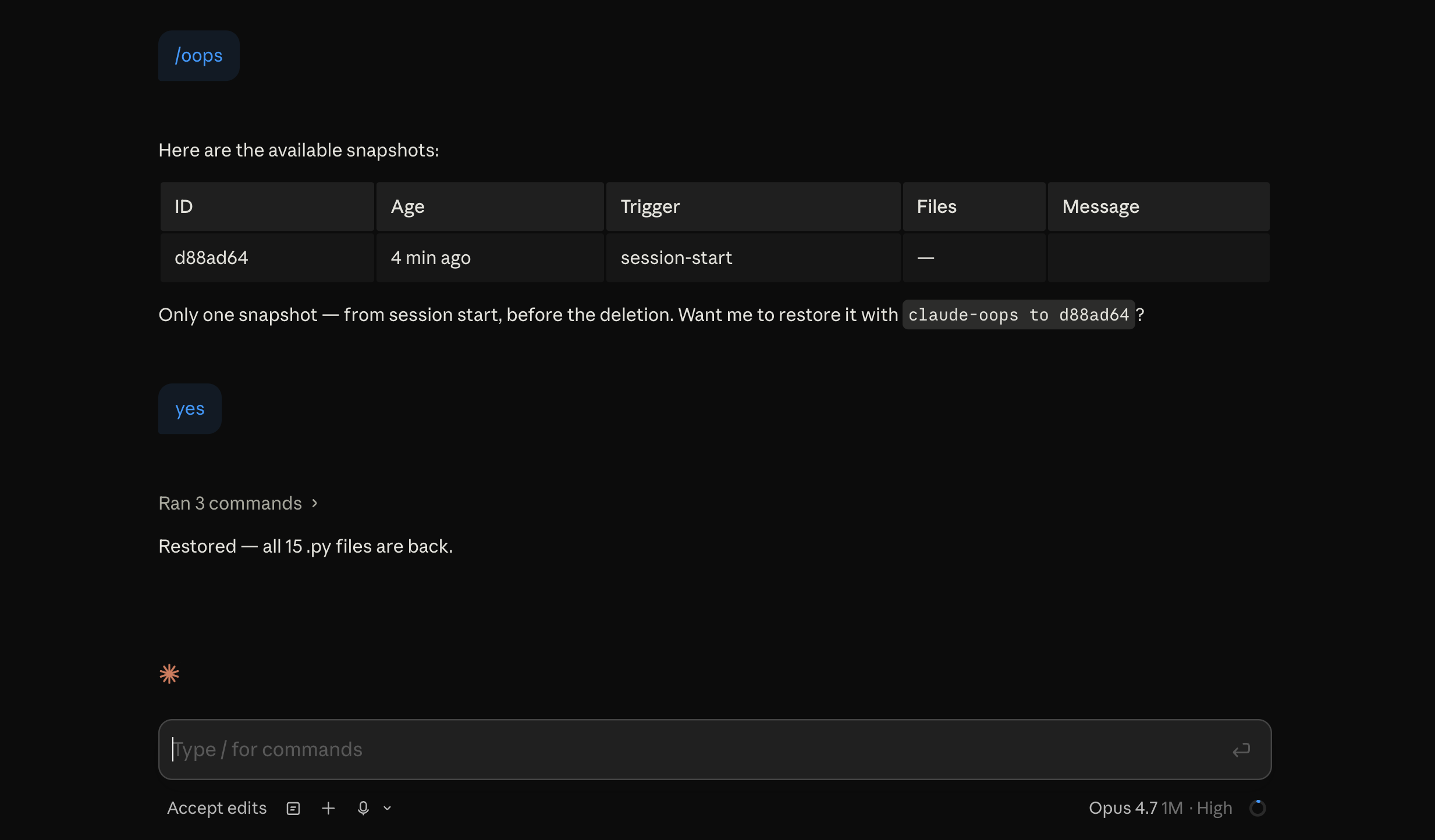 Automatic safety net for Claude Code: snapshot before risky ops, restore in seconds.