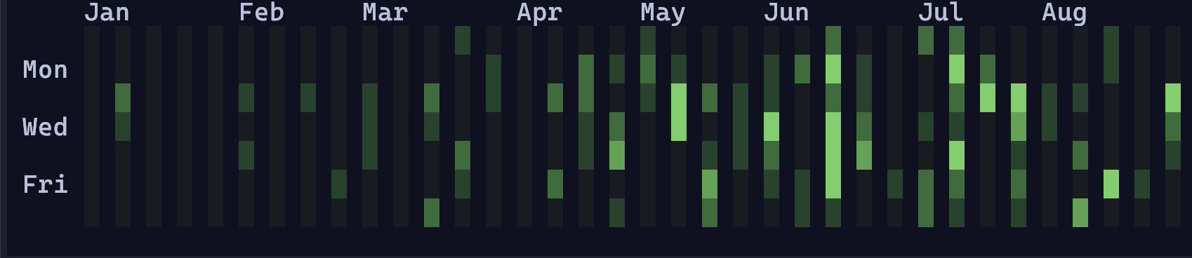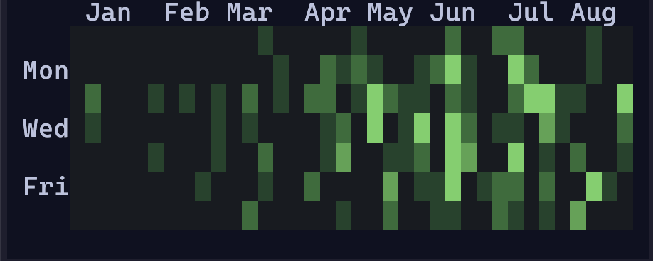 By default, `gitcal` will display past 365 days of information. However, the `--timespan` argument can be used to input a human-readable timespan (as measured relative to the current date). See [`jiff`'s documentation](https://docs.rs/jiff/latest/jiff/fmt/friendly/index.html) for some examples of valid inputs. For example `--timespan '3 months'` will give you the past three months of data. I plan to eventually add start and end date arguments, if anyone wants to do it with a PR, feel free.