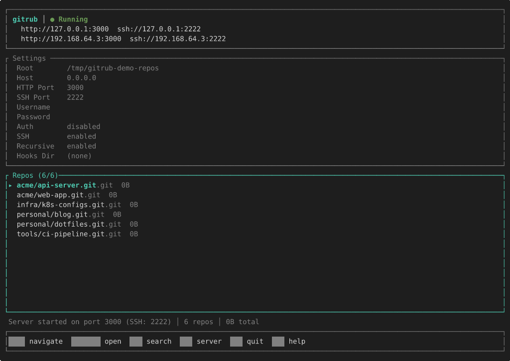 A local git server — push, pull, clone over HTTP and SSH with LFS, hooks, and more