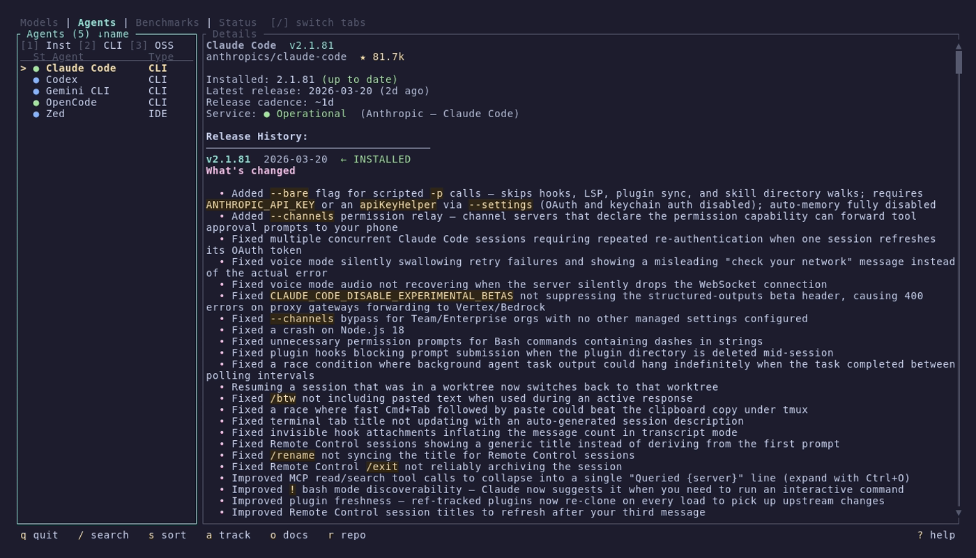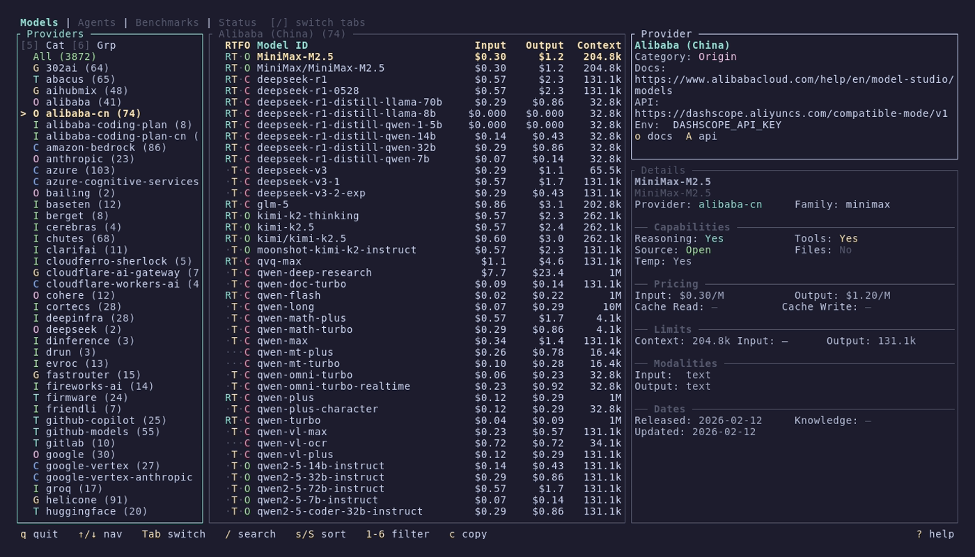 A fast TUI and CLI for browsing AI models, benchmarks, and coding agents