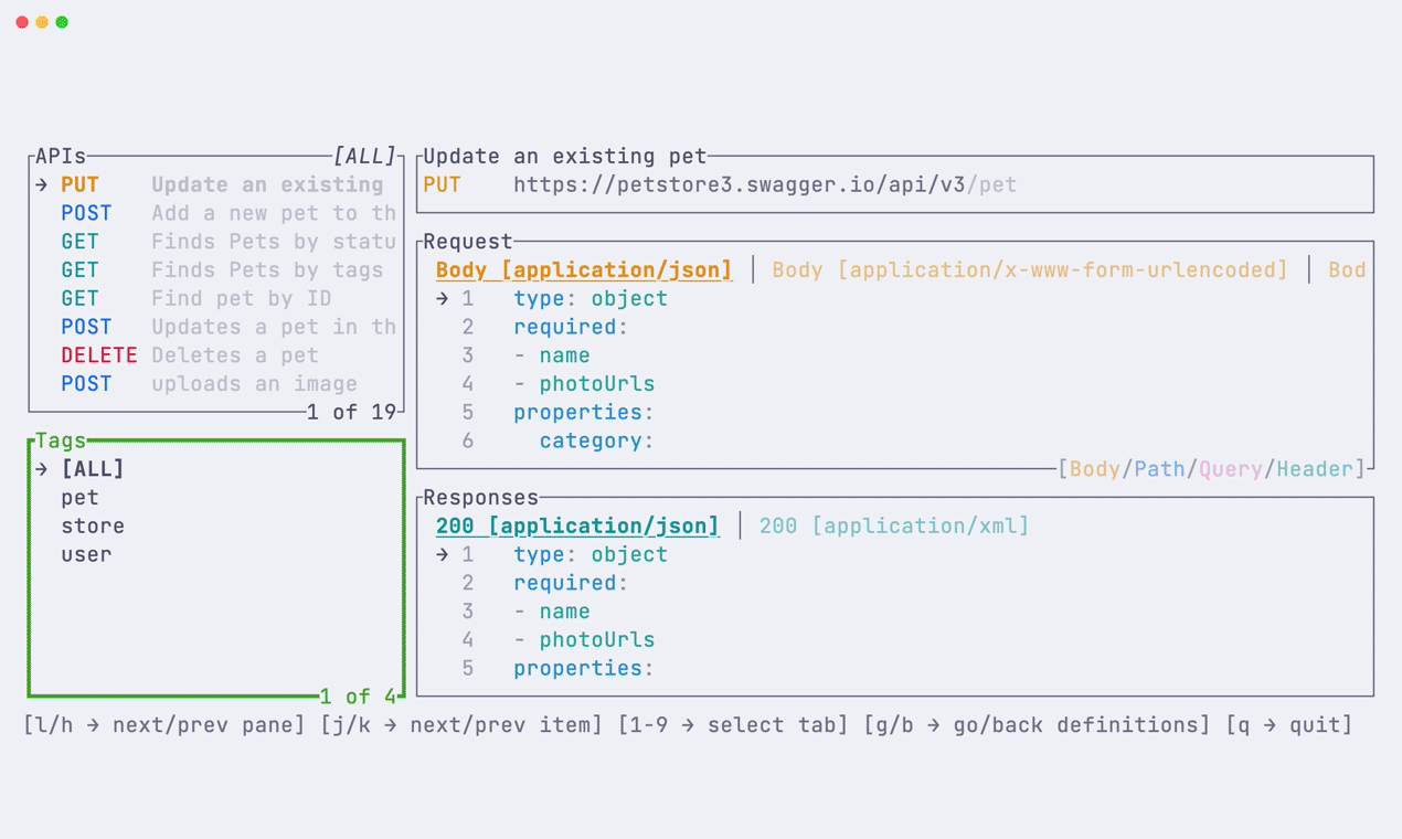 This TUI allows you to list and browse APIs described by the openapi specification.