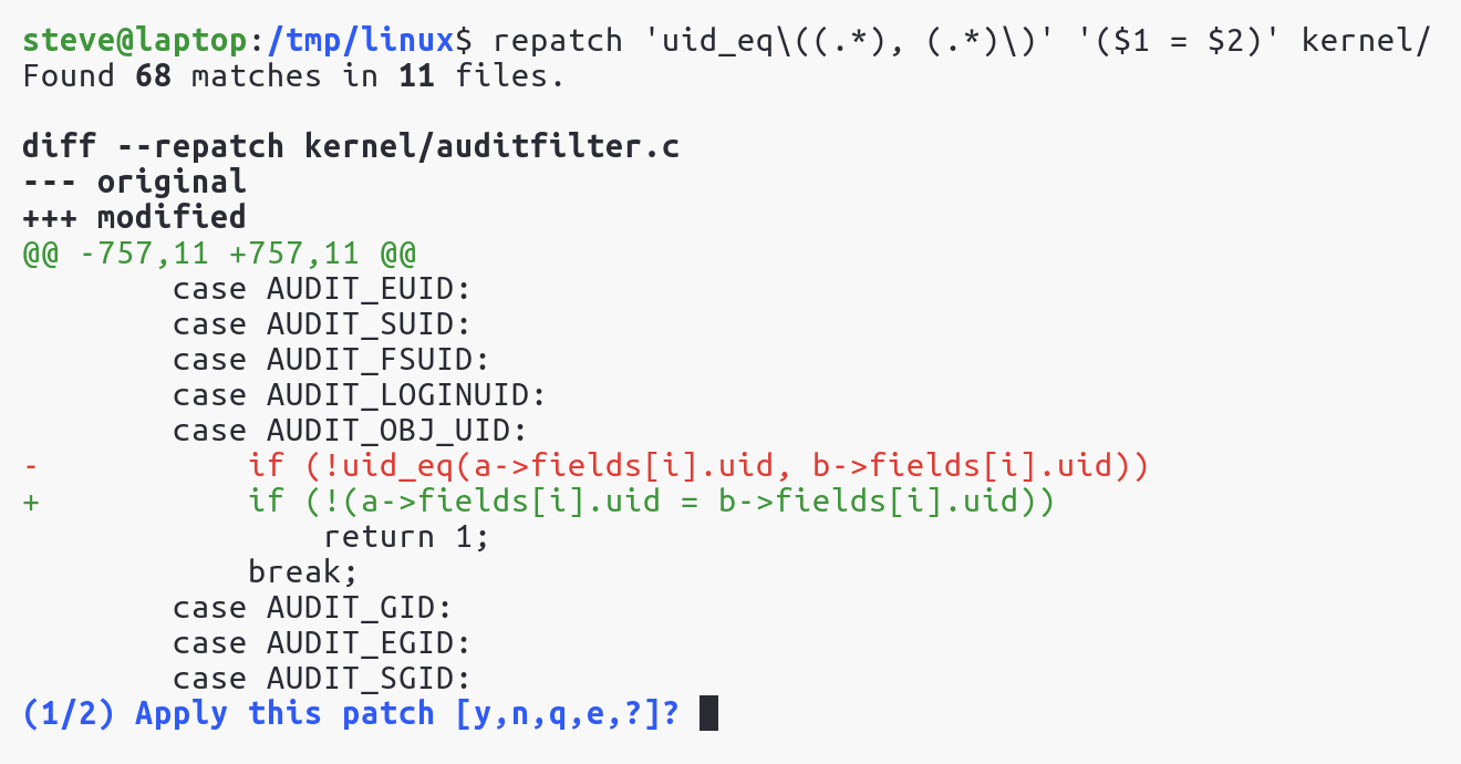 A regex find-and-replace tool with a `git add --patch`-like interface.