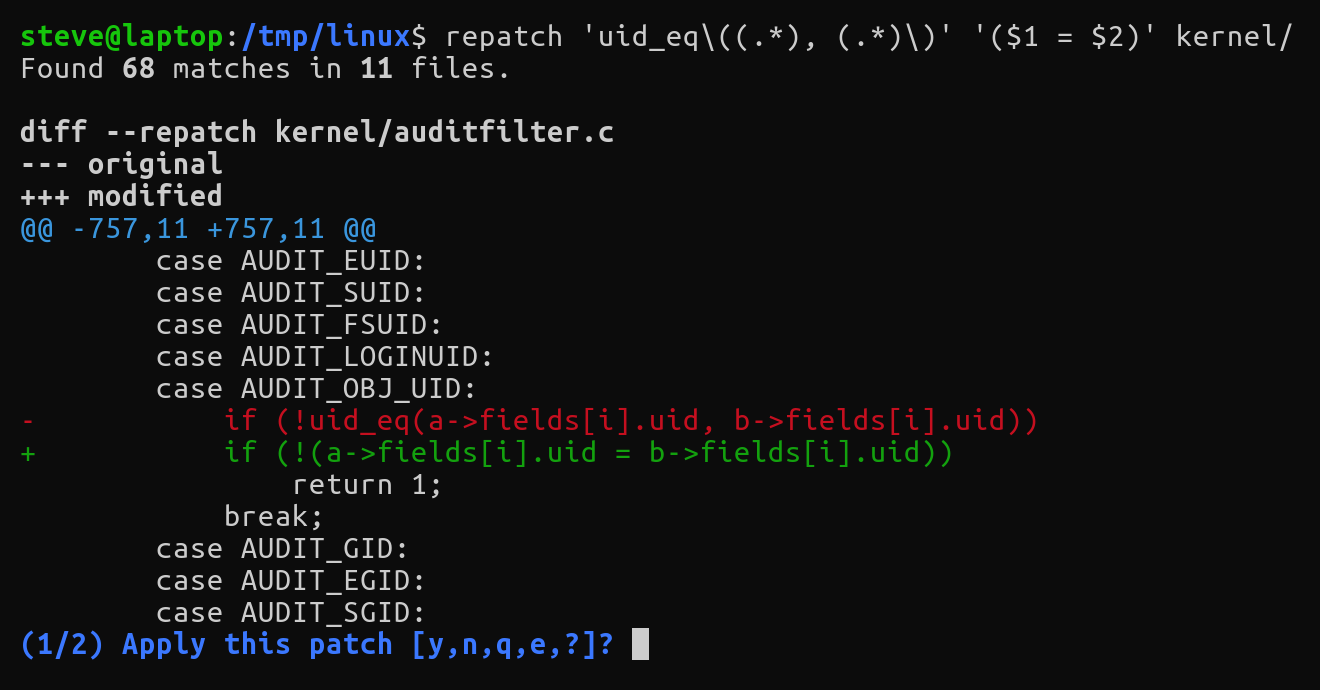 A regex find-and-replace tool with a `git add --patch`-like interface.