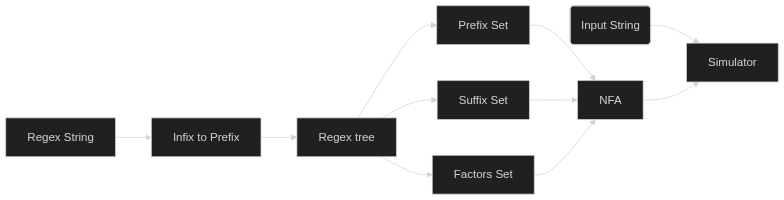 The regex function uses the regular expression string to create a NFA that can be used to simulate the regular expression. The program uses the Glushkov’s construction algorithm to create its NFA. The NFA is then later simulated to check if the input string matches the regular expression.