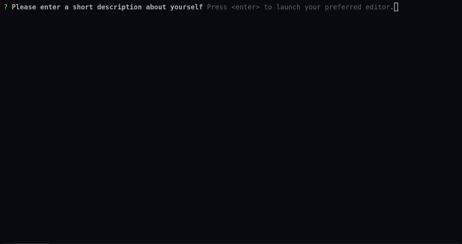 use requestty::Question; let editor = Question::editor("description") .message("Please enter a short description about yourself") .extension(".md") .build();