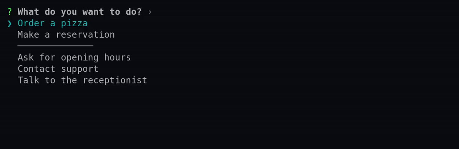 use requestty::{Question, DefaultSeparator}; let select = Question::select("theme") .message("What do you want to do?") .choices(vec![ "Order a pizza".into(), "Make a reservation".into(), DefaultSeparator, "Ask for opening hours".into(), "Contact support".into(), "Talk to the receptionist".into(), ]) .build();