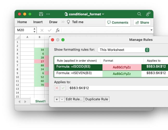 Example of adding a Formula type conditional formatting to a worksheet. Cells with odd numbered values are in light red while even numbered values are in light green.